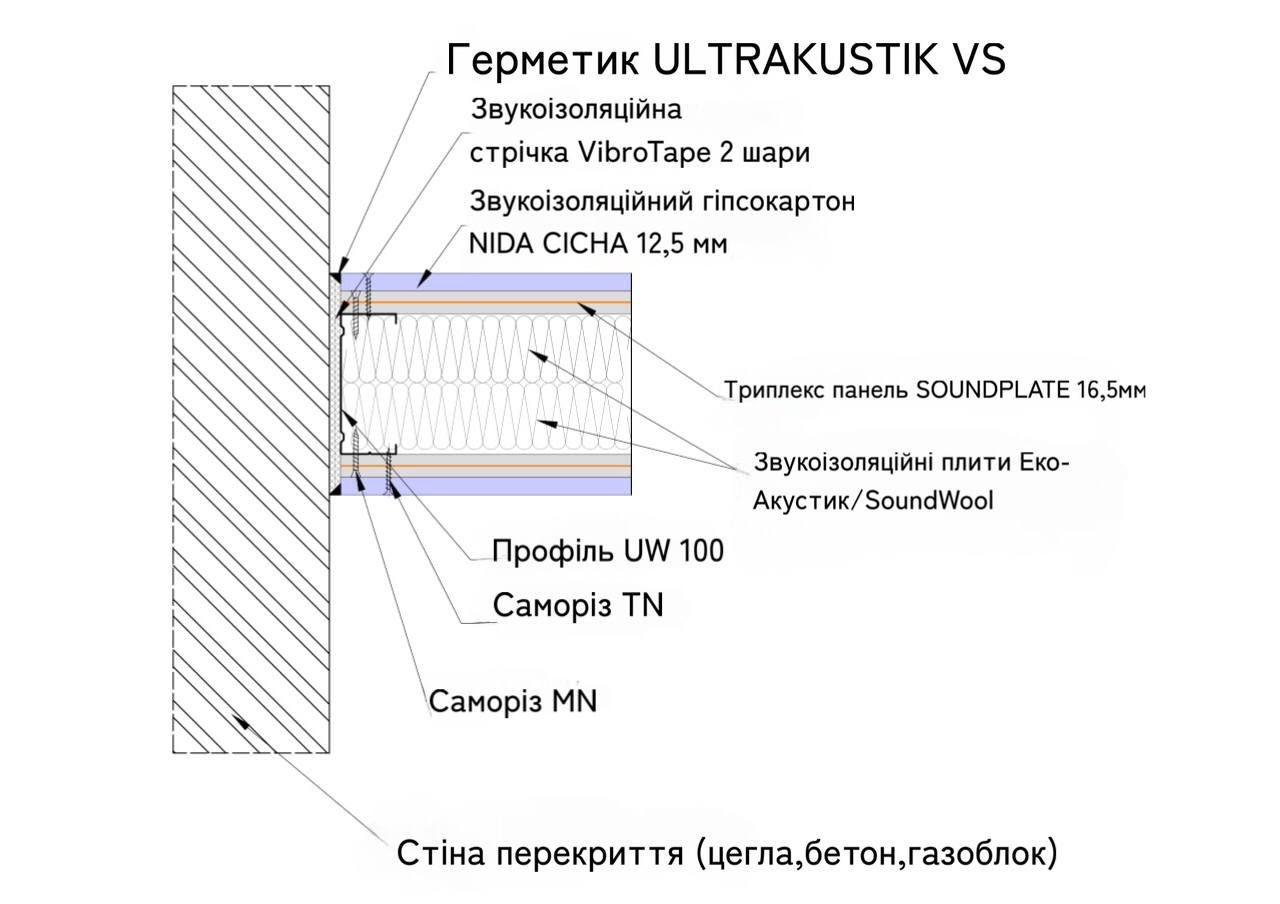 За умови заповнення внутрішнього простору звукопоглинаючими плитами Soundwool або ЕКО перегородка на каркасі CW/UW, обшита з двох сторін листами акустичного триплекса Soundplate і фінішними листами гіпсокартону NIDA CHICA забезпечує індекс ізоляції повітряного шуму Rw = 59 - 61 дБ!