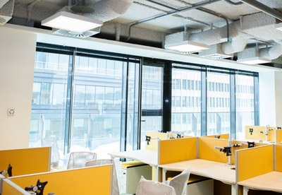 - Звукоізоляція між робочими місцями і створення акустичного комфорту в приміщеннях open space (звукопоглинальні офісні перегородки, підвісні і напилювані акустичні стелі);