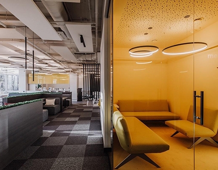 - Звукоізоляція між робочими місцями і створення акустичного комфорту в приміщеннях open space (звукопоглинальні офісні перегородки, підвісні і напилювані акустичні стелі);