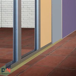 Каркасна звукоізоляційна перегородка примикає до огороджувальних конструкцій виключно через два шари вібродемпфіруючої підкладки Vibrotape-T150. Металеві профілі CW50 встановлюються з кроком 600 мм.