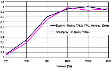 Криві ревербераційних КЗП покриття Sonaspray K13 і панелей Ecophon, змонтованих в контакті з основою.