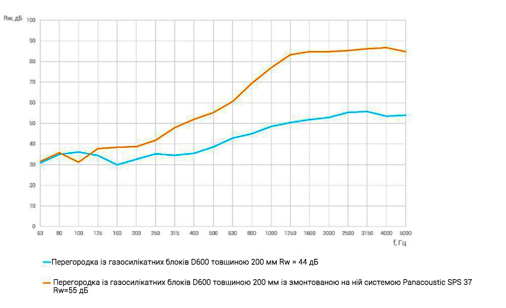 Індекс додаткової ізоляції повітряного шуму системою Panacoustic SPS 37 ΔRw = 11 дБ.