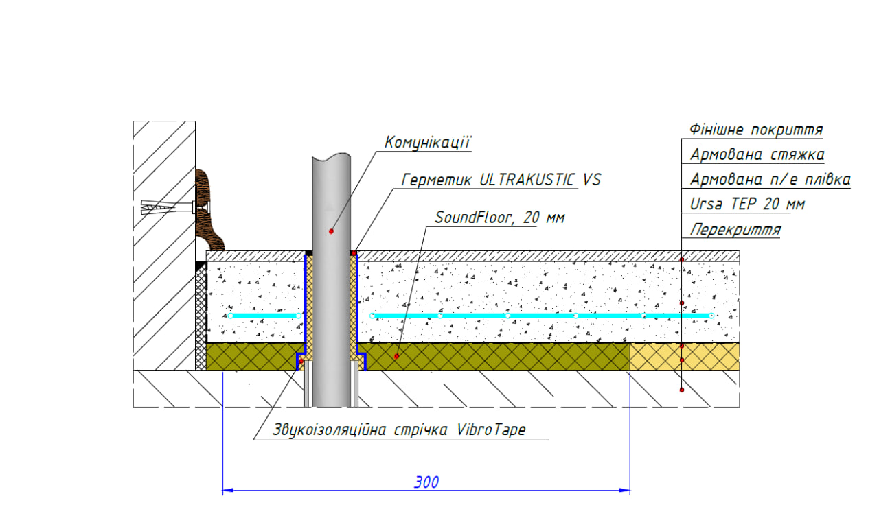 Найбільш ефективним рішенням є цементно-піщана стяжка на звукоізоляційних плитах Soundfloor або URSA TEP20, які забезпечують додаткову ізоляцію ударного шуму до 43 дБ і додаткову ізоляцію повітряного шуму до 13 дБ.