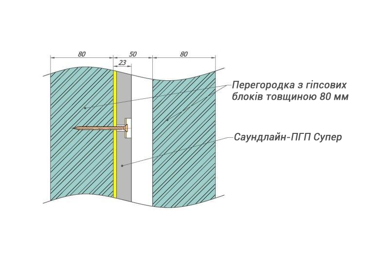 Чим менше власна звукоізоляція перегородки - тим вище доданий ефект. Наприклад, для перегородки з вихідною звукоізоляцією 34 дБ приріст складе близько 10 дБ (Rw = 44 дБ), а для перегородки з індексом Rw = 39 дБ додаткова звукоізоляція дорівнює 6 дБ (Rw = 45 дБ). При зведенні подвійних перегородок з гіпсолітових блоків із зазором 50 мм, розміщення панелі SPS Лайт всередині конструкції на будь-якій з стін збільшує звукоізоляцію системи на ΔRw = 7 дБ без втрати додаткового простору.